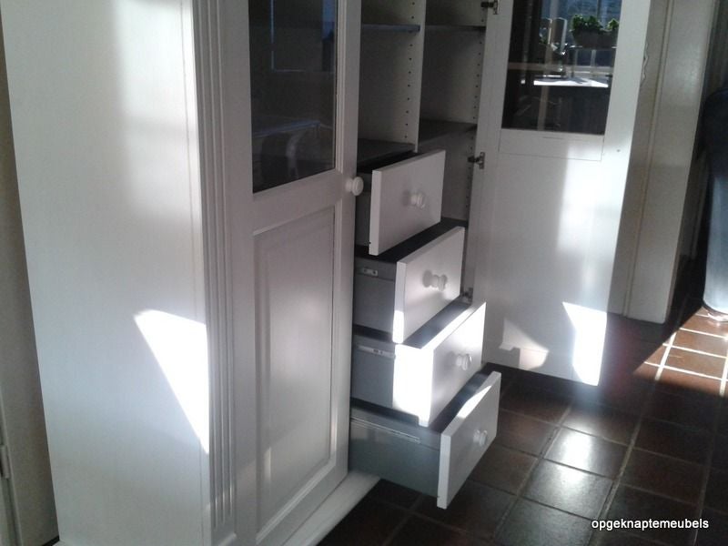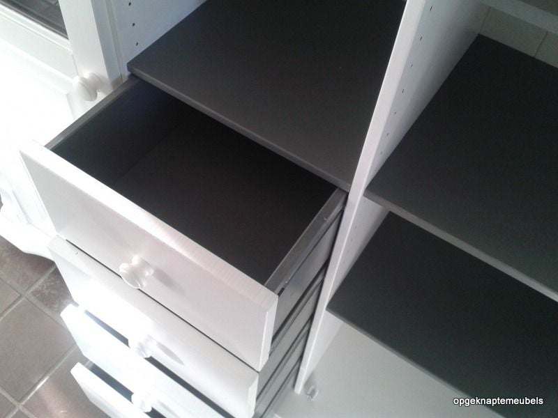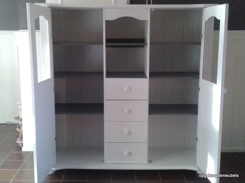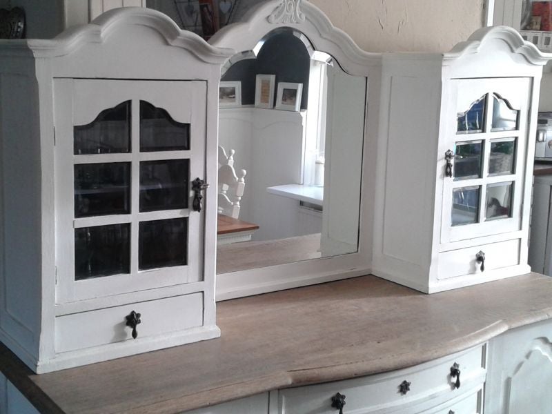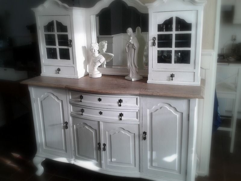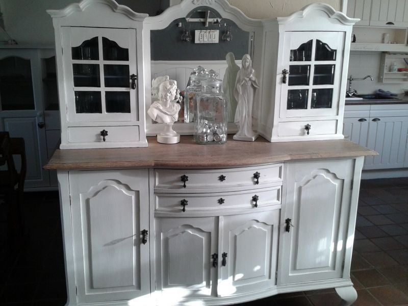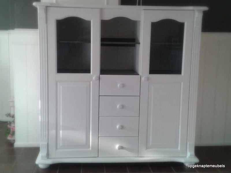 Servieskast a la Riviera Maison. De buitenkant is off-white, en de binnenkant grey. in het middelste gedeelte zit verlichting..zo gezellig 's avonds!
