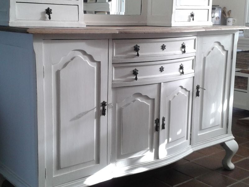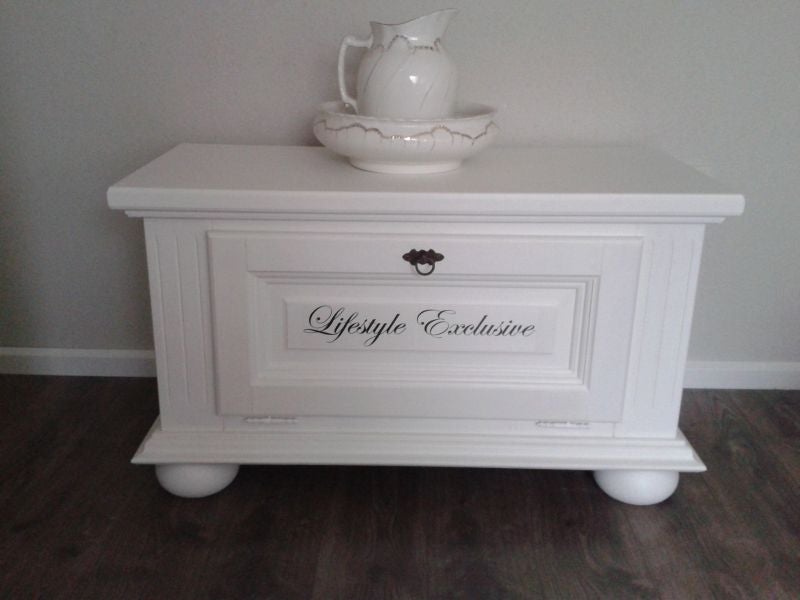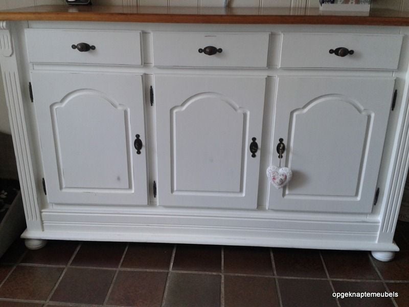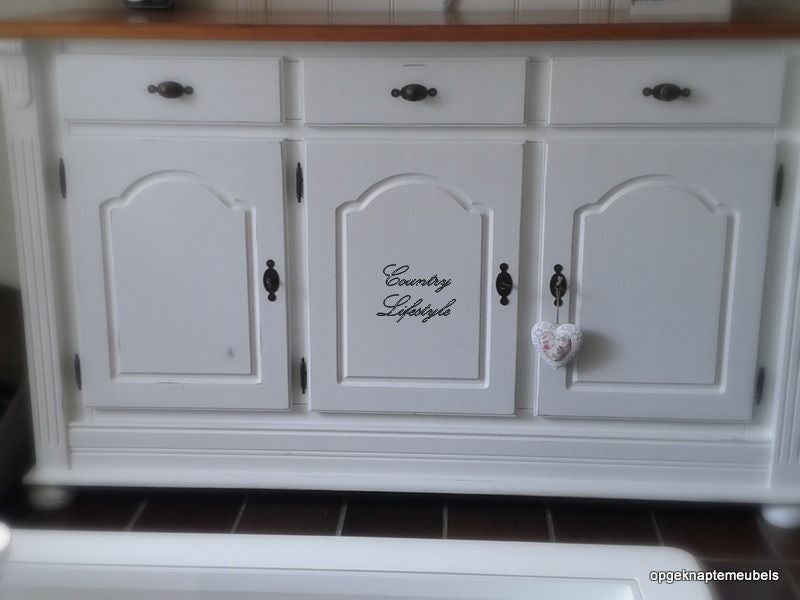 Landelijk dressoir in Riviera White met tekst en mooi beslag.