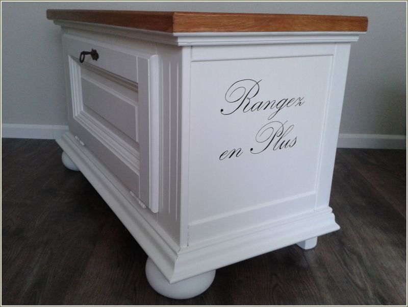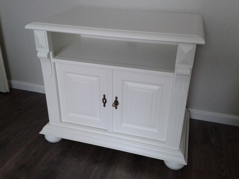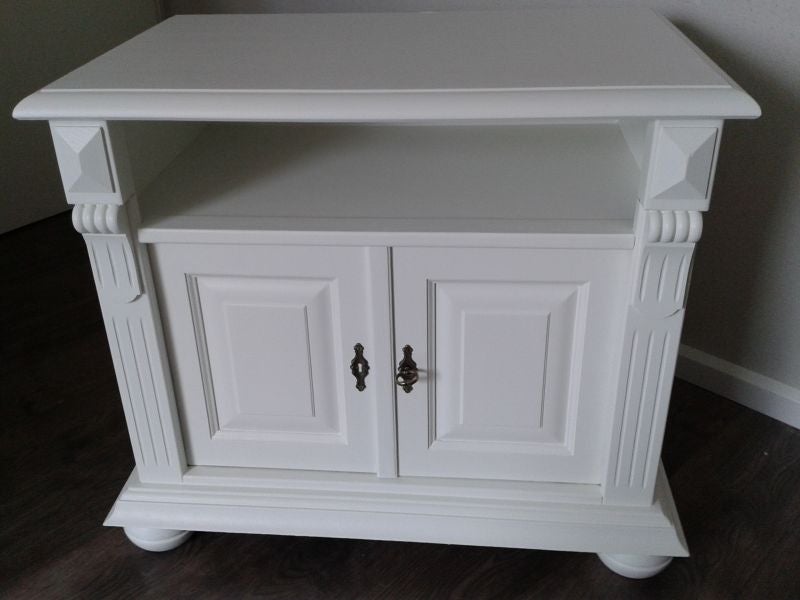 TV meubel met verschillende mogelijkheden. Op de linkerfoto is de tekst in de vorm van een sticker, maar ook tekst geschreven met de hand is mogelijk(foto rechts)